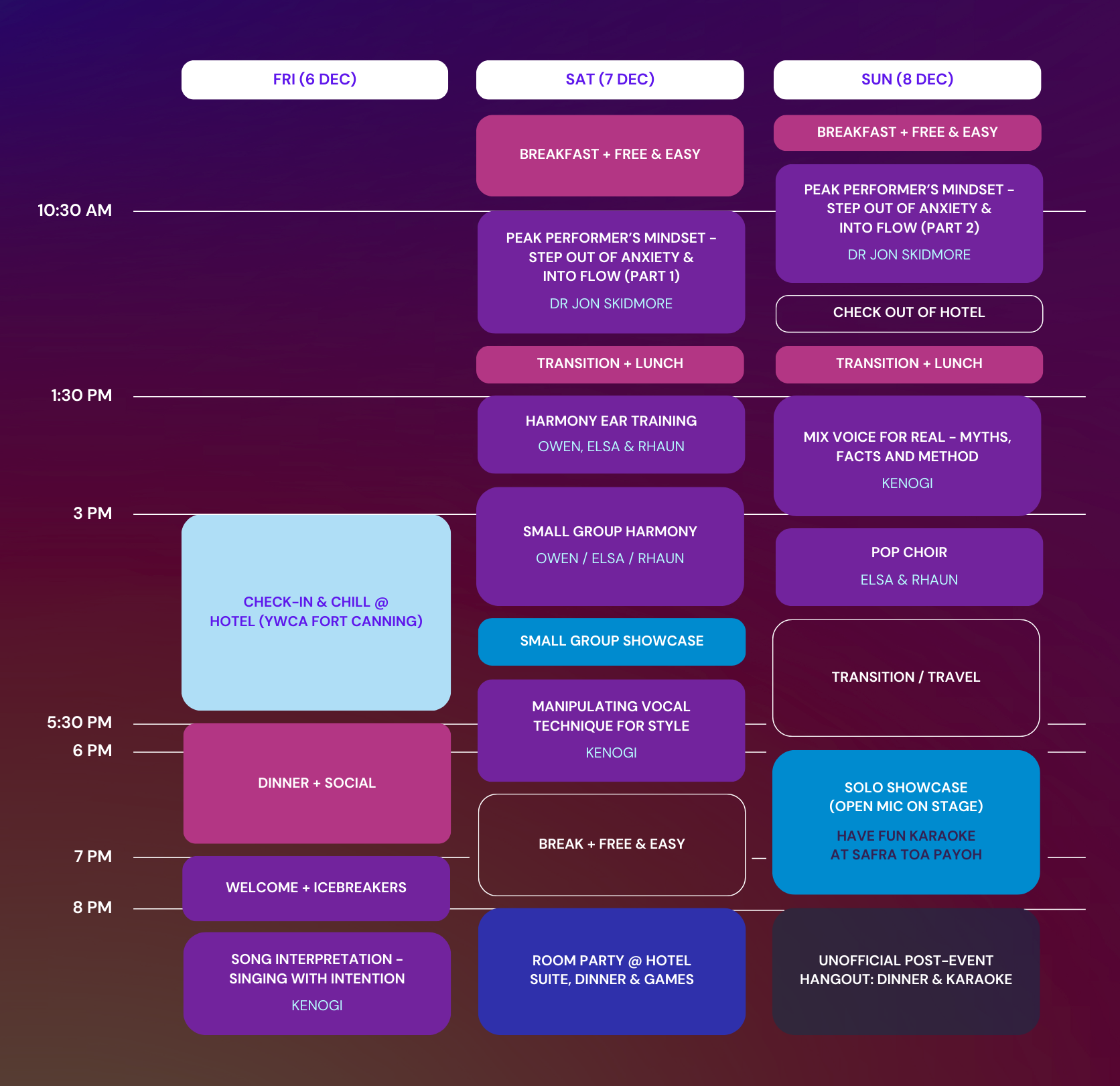 Immerse yourself in a weekend of social activities and workshops in vocal technique, conquering stage fright & peak performance mindset, harmony singing, style, and performing, conveniently located in the heart of Singapore.